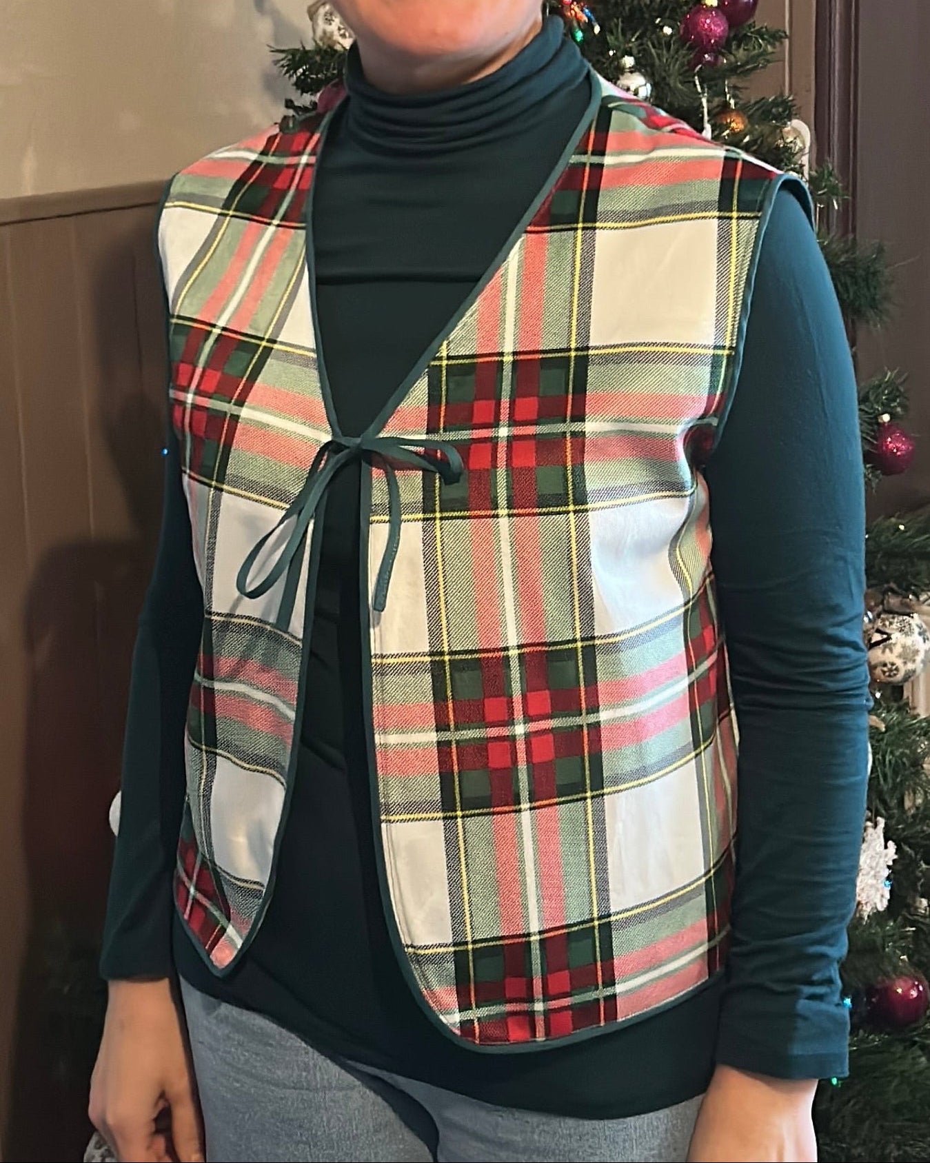 âšAvec sa touche de "tartan", ce gilet sans manche peut apporter un peu d'originalitĂ©, et, en fonction du reste de votre tenue, faire ressortir votre petit cĂŽtĂ© rock. Il se ferme avec un noeud.